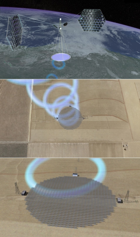 На иллюстрации антенная решётка выглядит просто-таки идиллически. К сожалению, авторы проекта ничего не говорят о том, что произойдёт, если "прицел собьётся". Наоборот, предусмотрена опция передачи микроволнового луча с одного передатчика на несколько антенных решёток. Считается, что эксперименты на животных не подтвердили возможного негативного влияния – на Земле интенсивность микроволн составит около одной шестой от интенсивности солнечного света в полдень (иллюстрация NSS).